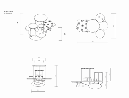 -La zone zone jaune à fleurs rose, (la zone d’eau). Des nuages de brumes d’eau sortent des fleurs afin de se rafraichir pendant les beaux jours. L’eau de la pluie tombe sur les deux toits. Elle est ensuite acheminée par gravité à basse pression par les tuyaux qui maintiennent la structure afin d’être conservée dans un grand réservoir. Lorsque les brumes sont activées, l’eau est acheminée dans un autre réservoir afin d’être filtrée. Enfin, elle passe dans dans une pompe de brumisation à haute pression avant d’arriver aux buses placées aux centre des fleurs pour en jaillir et amuser la galerie !
